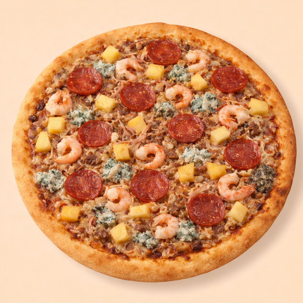 Salami, Pizzasuikale, Ananas, Katkarapu, Aurajuusto s, Katkarapu,