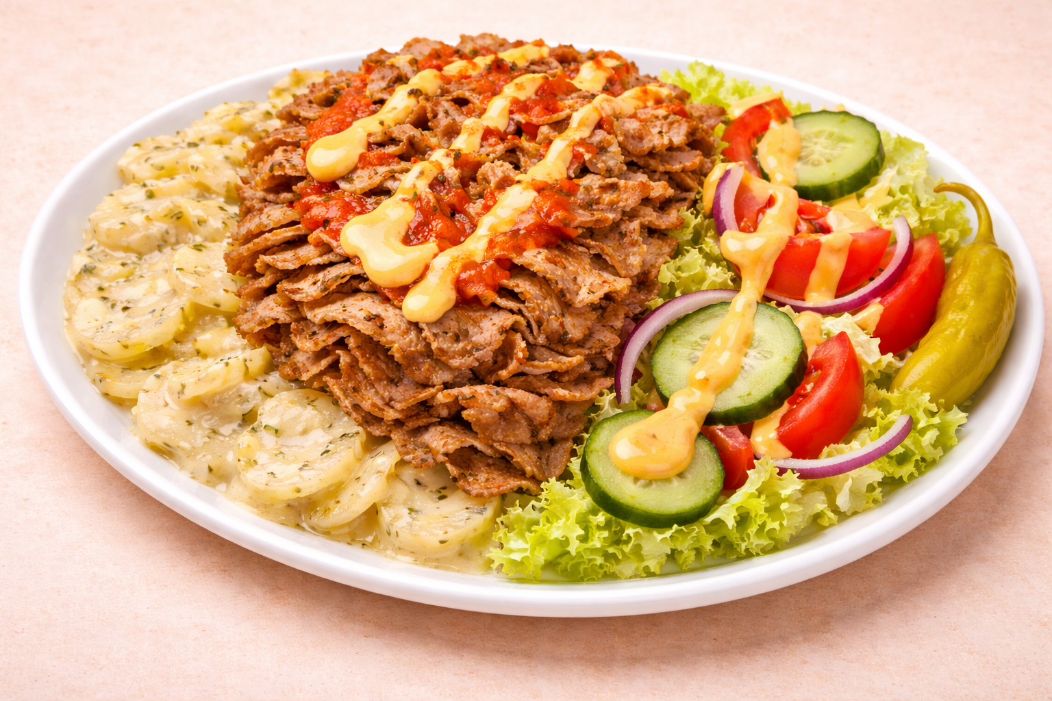 Kebabliha, Kerma-aurajuustoperunat, Salaatti, Tomaatti, Kurkku